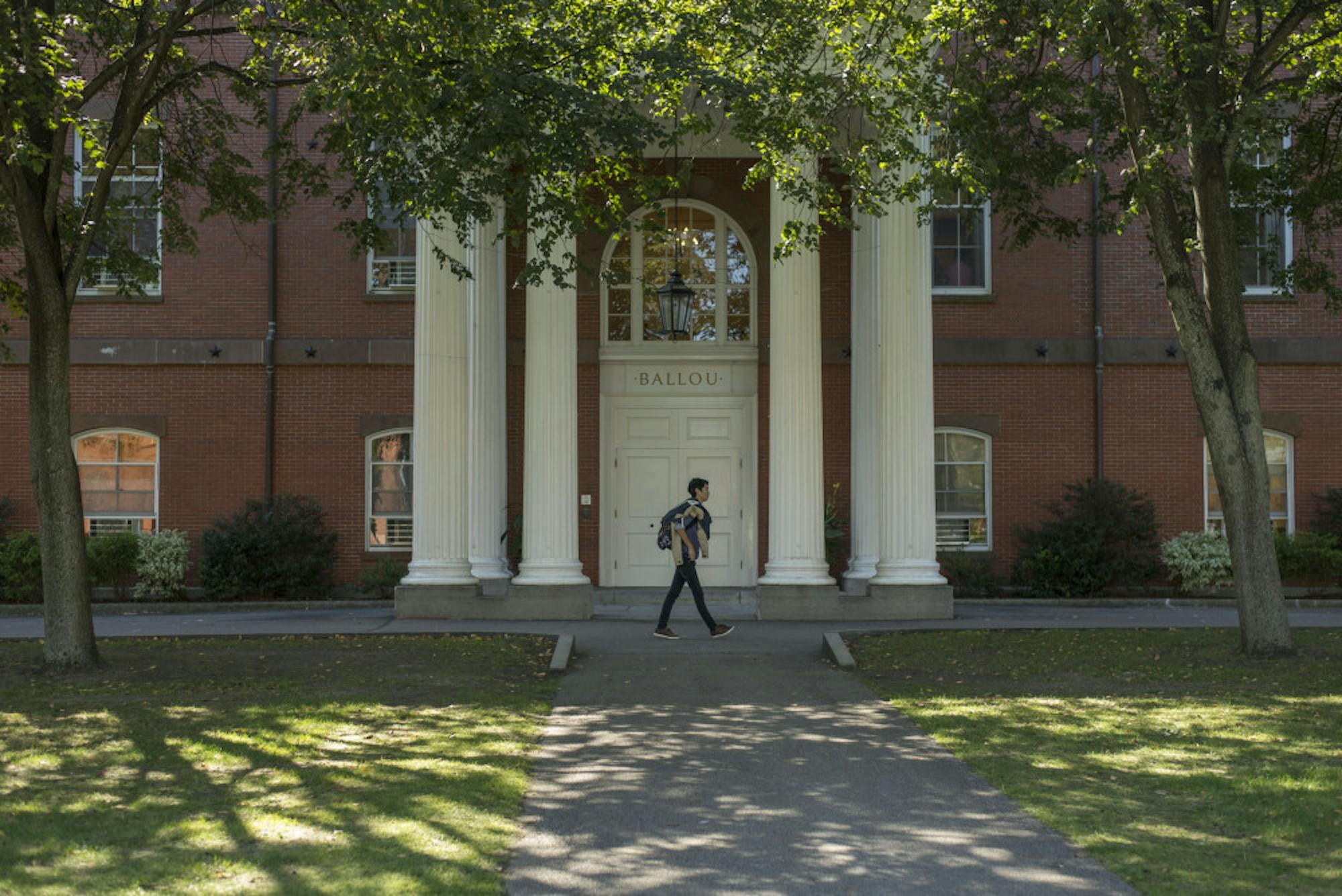 A student walks in front of Ballou Hall on Tufts' main campus in Medford/Somerville on Oct. 5, 2016.
